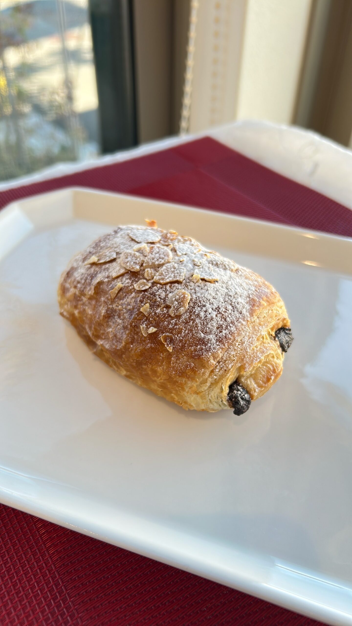 フランスの定番ヴィエノワズリー「パンオショコラ」。甘さ控えめのほろ苦いバトンショコラを2本巻き込み、香ばしいアーモンドをのせて焼き上げました。サクサク生地とカカオの余韻が広がる、大人の味わいです。